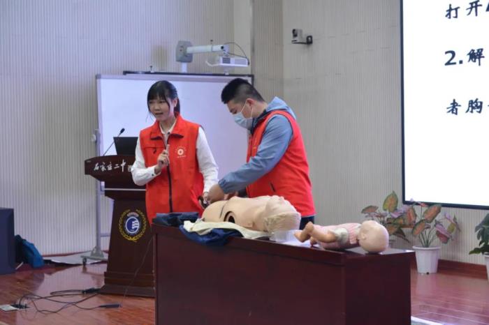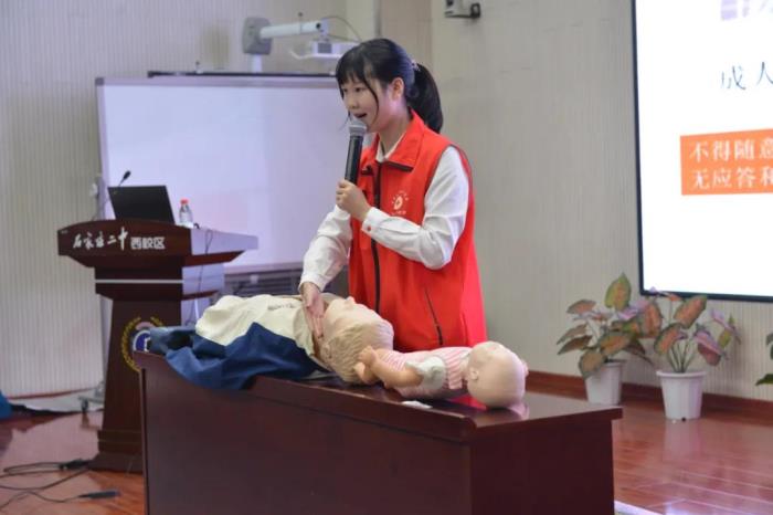 为了普及应急救护常识,建设平安校园,我校于4月13日在报告厅开展了校园急救知识培训讲座。讲座由石家庄市红十字应急救护核心培训师沙亚云主讲。沙女士是我校校友,曾获得河北省红十字应急救护大赛第一名、全国红十字应急救护大赛创伤技能操作操作第三名等荣誉。