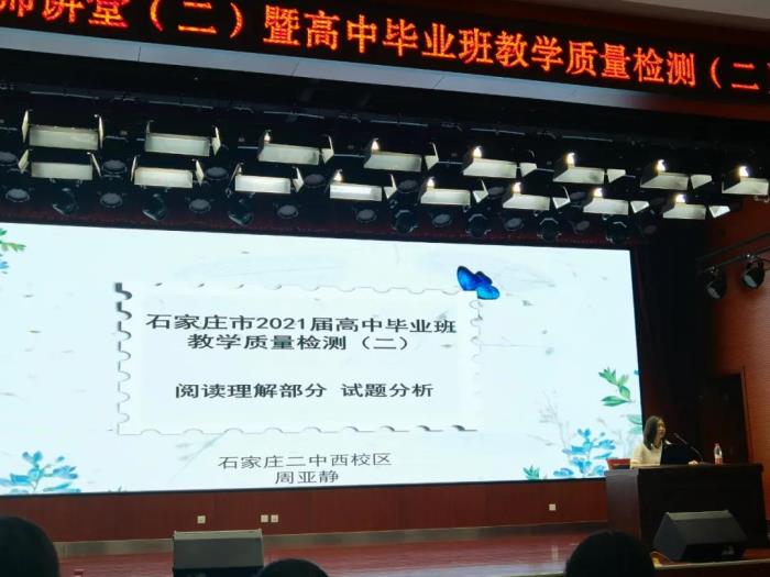 4月19日上午,由石家庄市教科所组织的市名师讲堂暨高中毕业班教学质量检测二英语学科分析会在河北师大附中召开。我校英语学科周亚静老师受邀在会上做了本次质检考试英语试卷阅读理解部分的分析与点评。