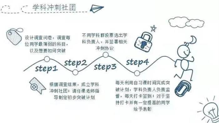 学校通过教师论坛沙龙的形式,交流小组合作评价方案,提升教学智慧。班主任和任课老师加强小组文化建设,培养学生互帮互助的品质。根据学生的基础能力、个人风格合理分配任务,让每一个学生在小组合作学习中散发活力,保持兴趣和动力。小组内还可以 设置海报评比、设计组徽、制作组牌、设定目标四大板块,商讨小组合作学习公约等。 在实践中,我校教师形成了各具特色的小组学习评价方案,并组织学科冲刺团、小组超级挑战赛、积分拍卖会、生物模型制作等活动,充分调动了同学们学习的积极性。