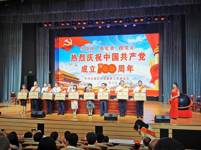 为庆祝中国共产党成立100周年,回顾党的奋斗历史,讴歌党的光辉业绩,凝聚建设现代化国际化美丽省会城市、教育强市的强大合力,6月28日上午,市委教育工委在石家庄二中秋实剧院组织召开石家庄市教育系统庆祝中国共产党成立100周年“七一”表彰大会。