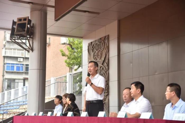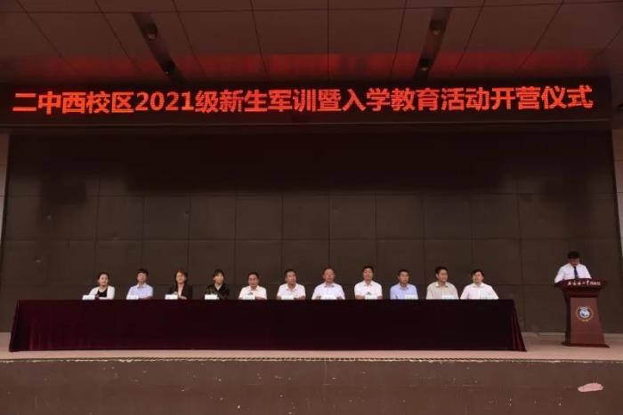 宽阔的田径场上,近千名新生整齐列队,激情饱满。出席开营式的领导嘉宾有全国“五一”劳动奖章获得者、 全国优秀教师王艾华老师,裕华区爱国拥军联合会会长荀福旺,二中西校区校长孙福山,党总支书记陈怀彦,副校长张永泽、樊茹、张尚英,工会主席查利等校领导和新高一、初一年级主任郭鹏飞、史丽娜。开营式由教育处刘建炜主任主持。