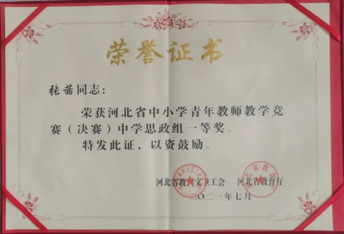 本次教学竞赛以“上好一门课”为竞赛理念,参赛选手需准备10个课时的教学设计方案,其中教学设计方案20分、现场抽签教学展示80分,总分为100分。我校思政教师张茜积极准备、刻苦钻研,在学校领导老师的大力支持下,凭借扎实的教学功底、充分的赛前准备,初赛荣获石家庄市中学思政组一等奖第一名,代表石家庄市参加省级决赛,最终荣获河北省青年教师教学竞赛一等奖的好成绩。