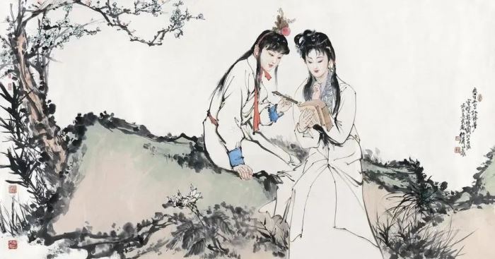 黛玉和宝玉再见时,已是深秋,气温反常地有些温柔,怡红院和潇湘馆里的绿竹蔚然依旧。贾母去了,北静王和黛玉一起去吊唁。宝玉看到黛玉,他愣了一霎,然后宝钗拉着他行了个礼。黛玉维持着面上的平静,也回了一个礼。她对北静王说去潇湘馆看看,坐到原来的绣榻上,她再也忍不住,想哭,眼中只落下一滴泪,咳出的血落在那曾经作的诗和宝玉送的旧帕上,就像一朵朵盛开的梅花。