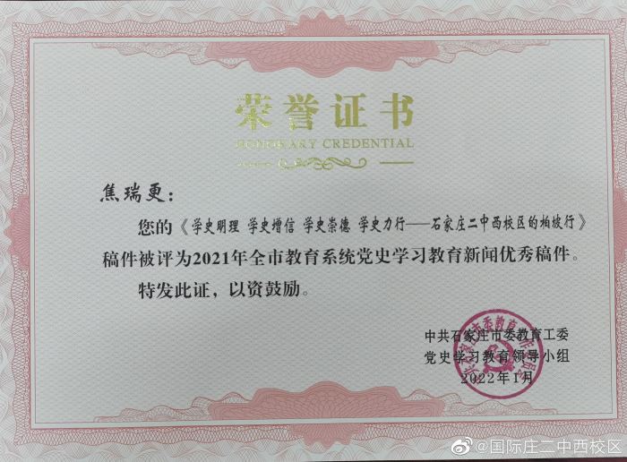 石家庄二中西校区荣获市教育系统党史学习教育新闻宣传先进单位称号