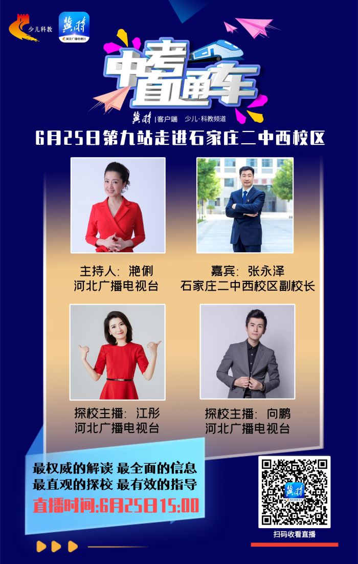 6月25日 河北广播电视台冀时客户端与少儿科教频道联合推出的全媒体大型公益节目《中考直通车》,走进了石家庄二中西校区,带领观众领略学校丰富的人文内涵和雄厚的办学实力。二中西校区张永泽副校长作为嘉宾为大家深入介绍了学校。欢迎各位家长、中考学子关注观看!
