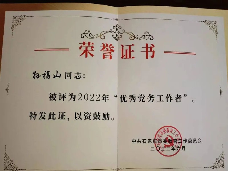 其中,二中西校区党总支被评为先进基层党总支。孙福山同志被授予优秀党务工作者,陈怀彦同志《构建新时期党建+发展模式》工作案例获基层党建优秀工作案例一等奖。我校石岚、王志泉、闫会波、王菁靖、郭亚社、封帅六位同志被市委教育工委授予2022年优秀共产党员,同时我校《构建党建+思政教育 三全育人强基铸魂》获优秀基层党建品牌。