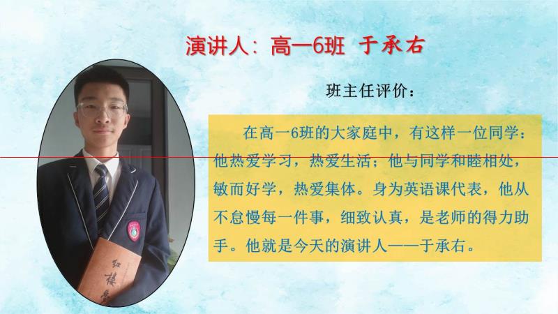大家上午好!我是高一6班的于承右。今天我演讲的题目是《迎接新年,备战期末》。