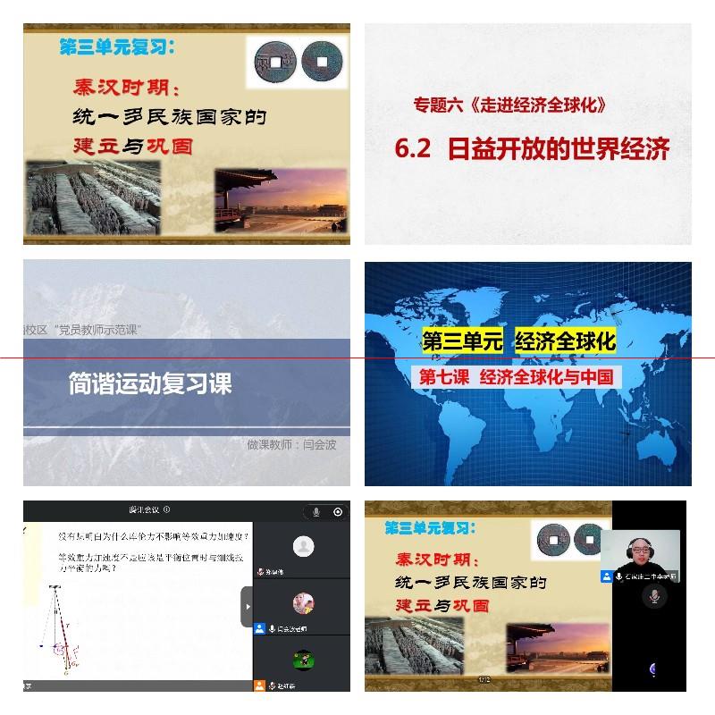 学校初中、高一、高二、高三四个支部分别推选出李铮、邢玉彬、闫会波、马爱静四位老师代表,于所任教班级线上课堂中面向全体教师作了精彩展示。四节公开课的课型均为复习课,与学校本学期课堂研究紧密挂钩,分别为:《秦汉时期:统一多民族国家的建立与巩固》(李铮)、《日益开放的世界经济》(邢玉彬)、《简谐运动复习课——航天中的单摆》(闫会波)、《经济全球化与中国》(马爱静)。