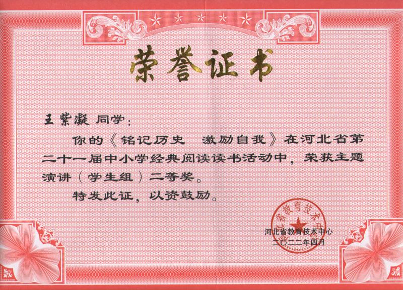 王紫凝同学像韩老师一样也是拿奖拿到手软,演讲作品《铭记历史,激励自我》分获第二十一届中小学经典阅读读书活动和“青春心向党 少年颂华章”读书活动两个河北省二等奖和石家庄市一等奖,