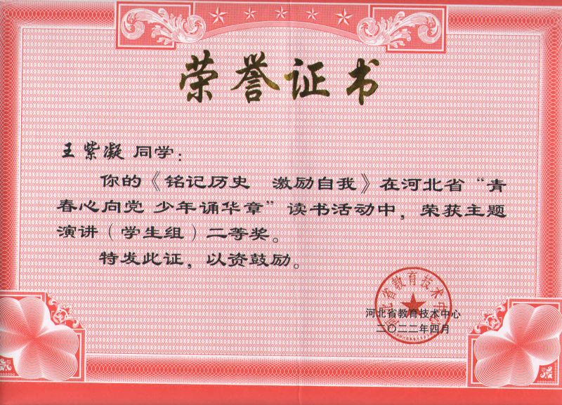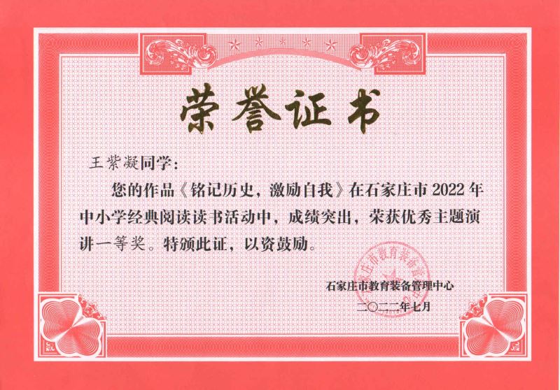 王紫凝同学演讲作品《铭记历史,激励自我》分获第二十一届中小学经典阅读读书活动和“青春心向党 少年颂华章”读书活动两个河北省二等奖和石家庄市一等奖。