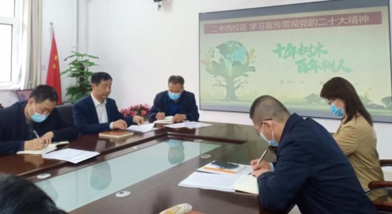 2023年4月10日,石家庄二中西校区孙福山书记主持召开党总支扩大会,深入学习宣传贯彻党的二十大精神,王成主任以《十年树木 百年树人》为题,做了主题发言,党总支理论学习中心组、全体中层、年级主任参加了会议。