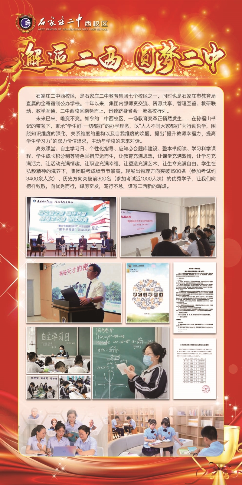 石家庄二中西校区是石家庄市教育局直属。河北省示范性高中,公立办学,市区二环内全寄宿制管理学校,学校融合石家庄二中教育集团i资源优势,不断跨越提升快速发展,教育教学成果丰硕,连续五年荣获高中教学先进单位荣誉称号!