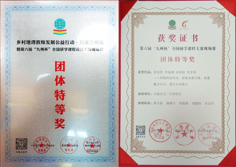 8月9日——13日,由《中学地理教学参考》编辑部、《地理教学》编辑部、地理学会联合举办的第六届“九州杯”全国研学课程设计大赛现场赛在兰州举行,我校潘力强、杨俊巧、刘俊燕、刘建炜、吴会玲5位地理名师工作室成员参赛并获团体特等奖,赢得殊荣。