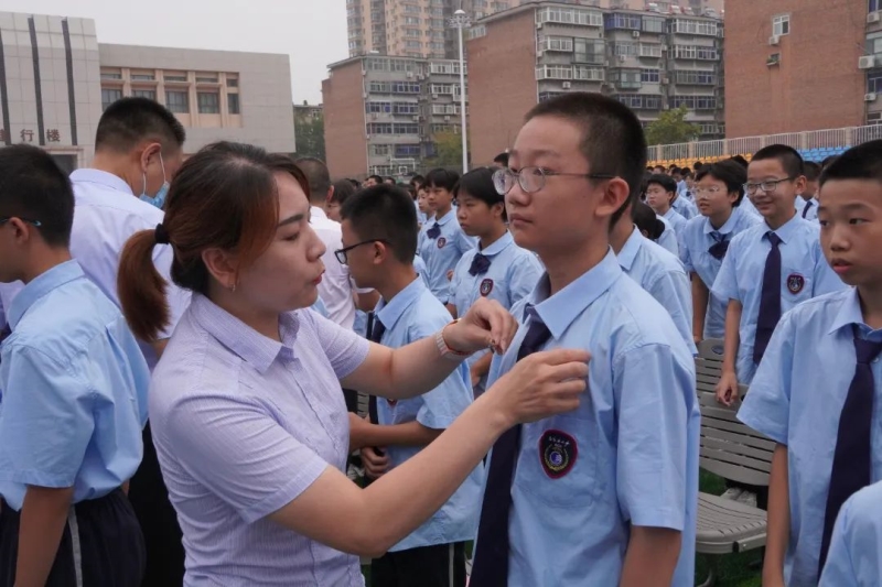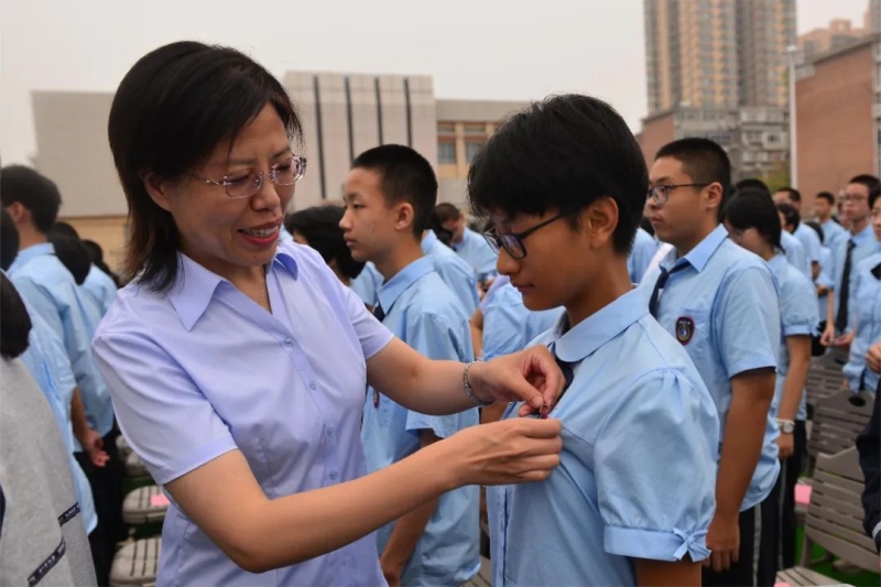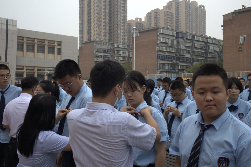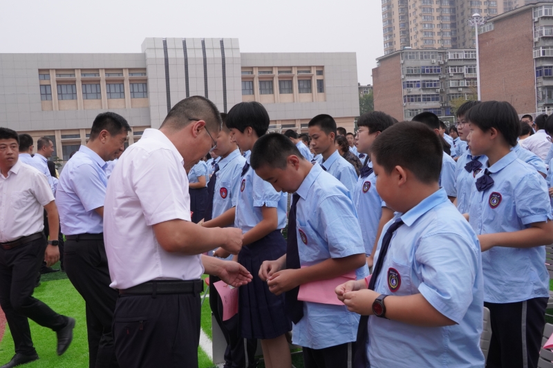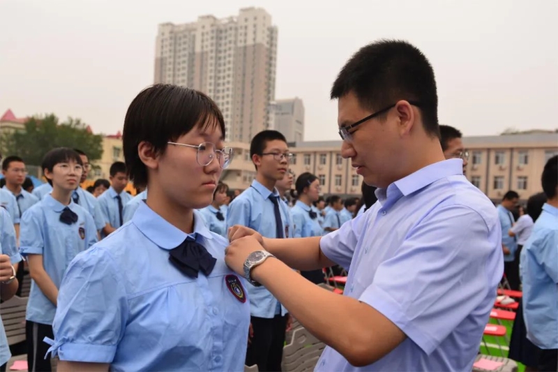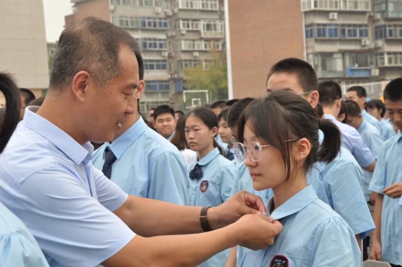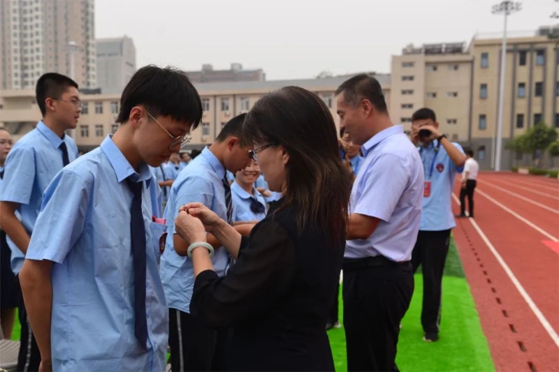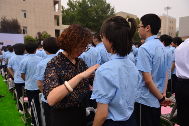 校徽是学校文化魅力展示的名片,是二中学子重要的身份象征。一枚小小的校徽,包含着自豪、荣耀,更有对母校的归属之情。由中层以上领导和初高一年级老师步入新生队伍为新生佩戴校徽。