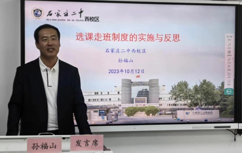 2023年10月12日,石家庄市二中西校区孙福山书记受河北师范大学教育学院的邀请,为新疆巴音郭勒蒙古自治州2023年度中小学校长培训班作了题为“选课走班制度的实施与反思”的主题分享。