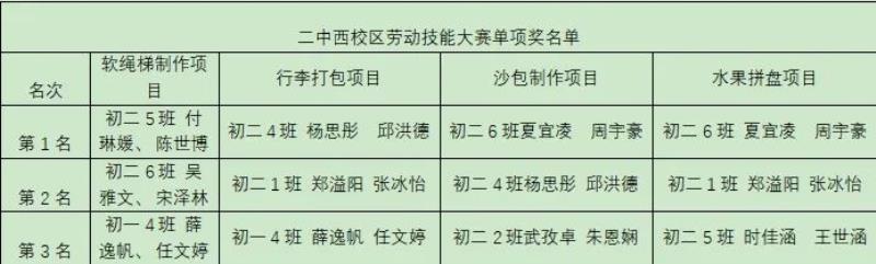 1、二中西校区首届劳动技能大赛单项奖名单: