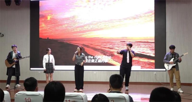 精彩现场表演伴随着阵阵掌声、尖叫声、欢呼声,将现场气氛推向了一个又一个高潮。在评委紧张为各团队打分的过程中,高二8班王芸芊同学带来了《大鱼海棠》的现场演奏,美妙琴声令人如痴如醉,赵子贺老师、安天晟老师携手逯宗侃、马鹏宇、刘钰涵同学一起带来的吉他弹唱更是引爆全场!