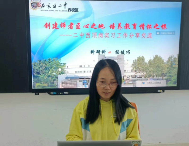 2023年11月1日,石家庄二中西校区科研科杨俊巧主任受河北师范大学顶岗办之邀,在第37期石家庄区域特聘名师及区县主管经验分享暨培训会上,以“创建师者匠心之地、培养教育情怀之根”为题,就我校顶岗实习生培养工作为石家庄区域百余名特聘名师作了经验分享。