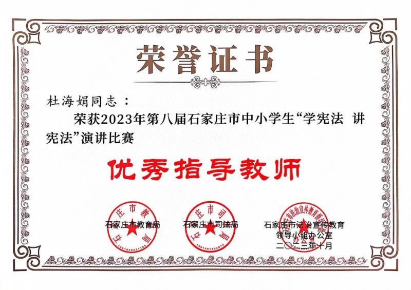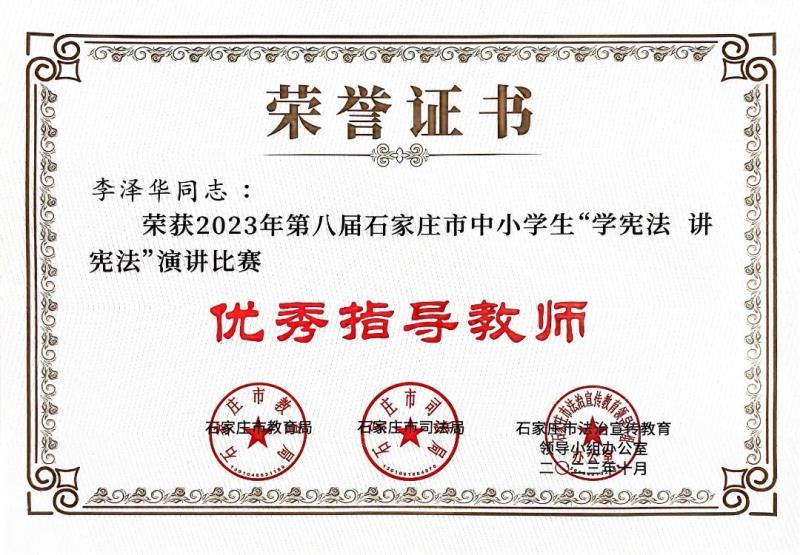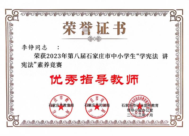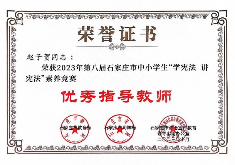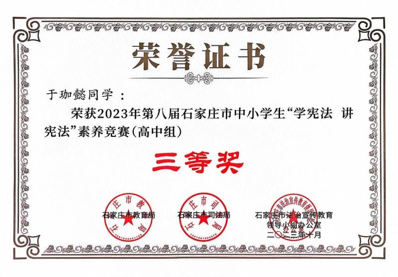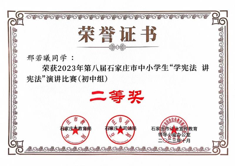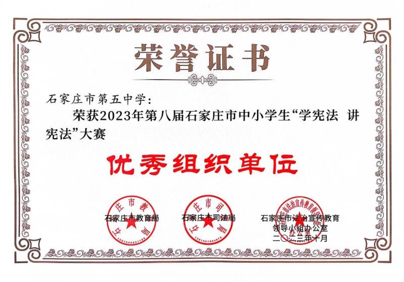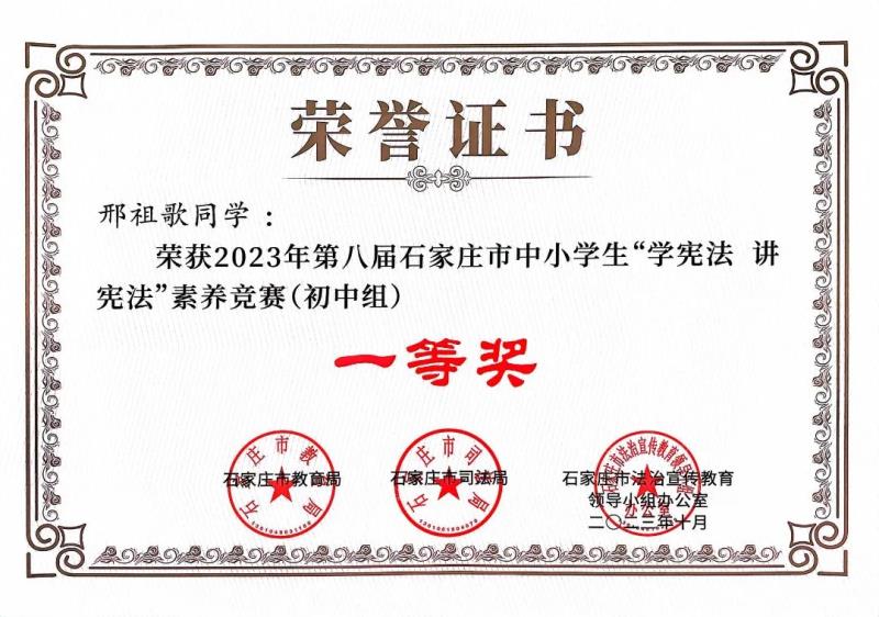 为深入学习贯彻习近平法治思想,落实国家“八五”普法规划和《青少年法治教育大纲》要求,推动全市青少年法治宣传教育走深走实,根据河北省教育厅《转发教育部办公厅关于组织开展第七届全国学生“学宪法 讲宪法”活动的通知》要求,市教育局举办了2023年石家庄市第八届“学宪法讲宪法”法治知识竞赛和演讲比赛。石家庄市二中西校区安全科积极组织学生代表参加,并取得优异成绩,荣获“优秀组织单位”奖。演讲比赛中,高程一同学荣获高中组三等奖,邢若曦同学荣获初中组二等奖;素养竞赛中,于珈懿同学荣获高中组三等奖,邢祖歌同学荣获初中组一等奖好成绩。好成绩也离不开老师们的辛勤付出,李泽华、赵子贺、李铮、杜海娟四位老师同时获得“优秀指导教师”奖。