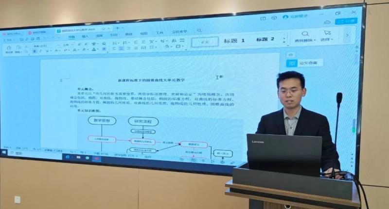 二中西校区李泽华老师分享了“圆锥曲线大单元教学设计”:圆锥曲线教学包含着庞大的知识体系,并且知识之间的联系紧密且复杂,如:椭圆,抛物线,双曲线的一些综合性大题等,这些知识在高中数学中是非常复杂的。因此,在课堂教学中,教师可进行大单元设计,把大的知识体系分解为小问题,使学生能够更好地理解问题、解决问题;又如“标准方程”“一般方程”的概念,通过统一化的问题情境引导学生利用所学,举一反三,从解决一个问题到解决一类问题,从而得到能力的提升。因此,“大单元”设计在课堂教学中是必要且有效的。