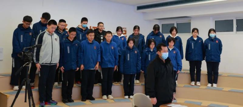 同学们肃穆地倾听每隔“12秒”一次的水滴声,在哀乐声中向南京大屠杀30万死难同胞默哀悼念。