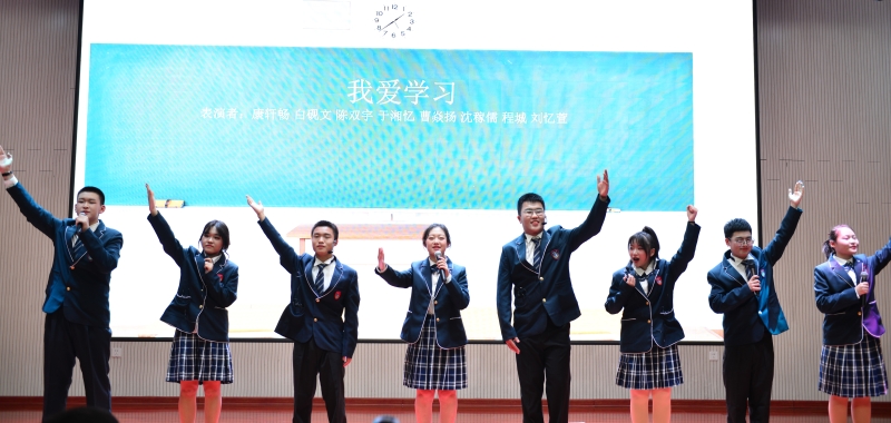 高一、高二年级同学共同演绎的诗朗诵节目《我爱学习》在轻松快乐的氛围中表达青年学生在实现人生理想路途中的重要途径——学习,现场掌声连连,喝彩不断。