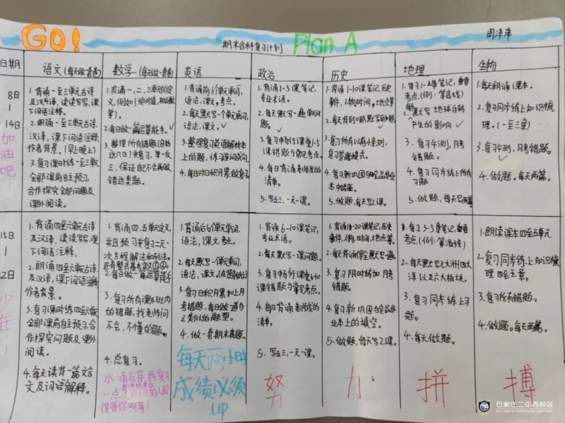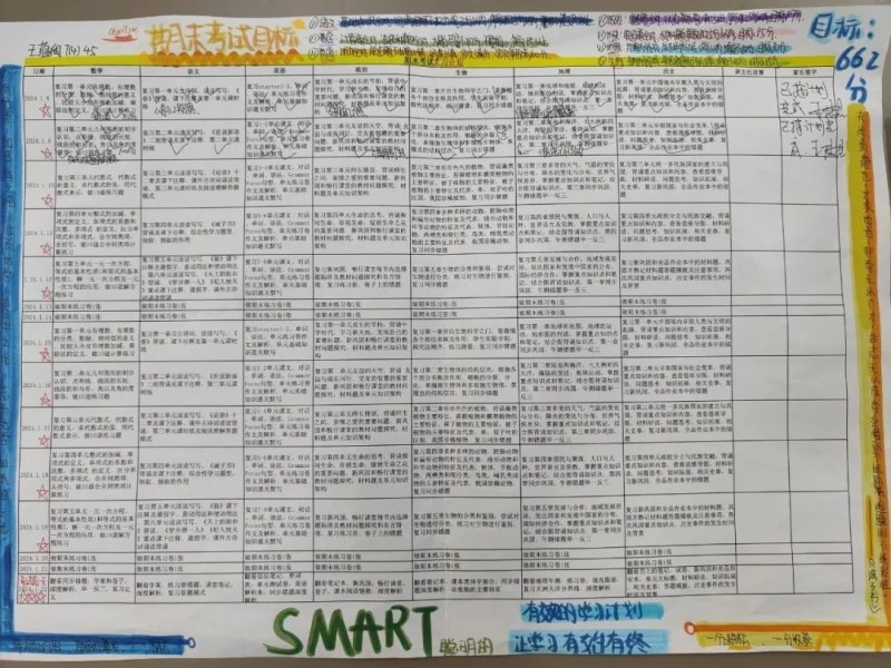 学生的复习计划详尽且图文并茂,充分展示了二西学子利用SMART原则制定期末考试目标和计划的过程及成果,展现了初一年级学生们善于思考、乐于尝试的学习精神。