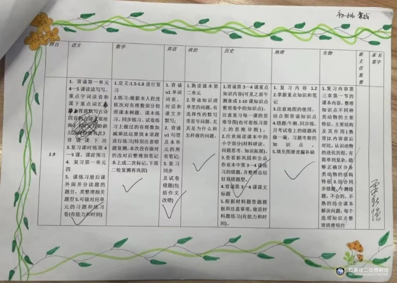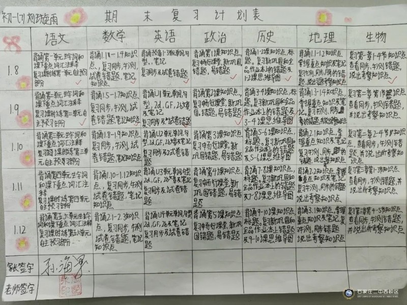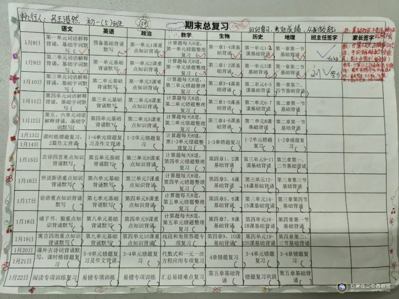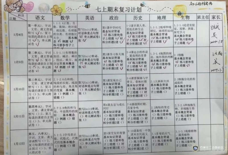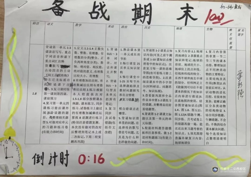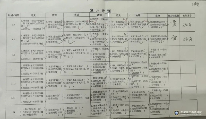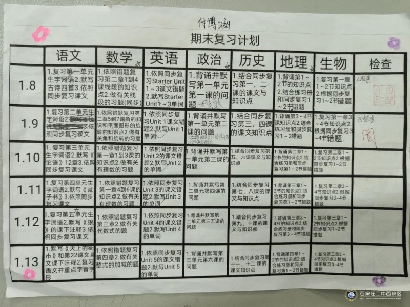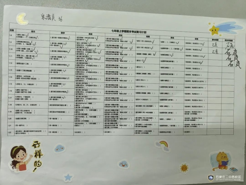 俗话说:工欲善其事,必先利其器。石家庄二中西校区初一年级以期末考试为契机,让学生能够将本学期的学习内容系统化,并进行查漏补缺,理清知识盲点,实现考试的真正价值,于是组织学生进行复习计划的制定并进行精准落实。
