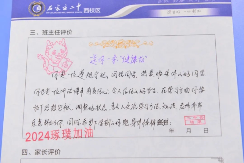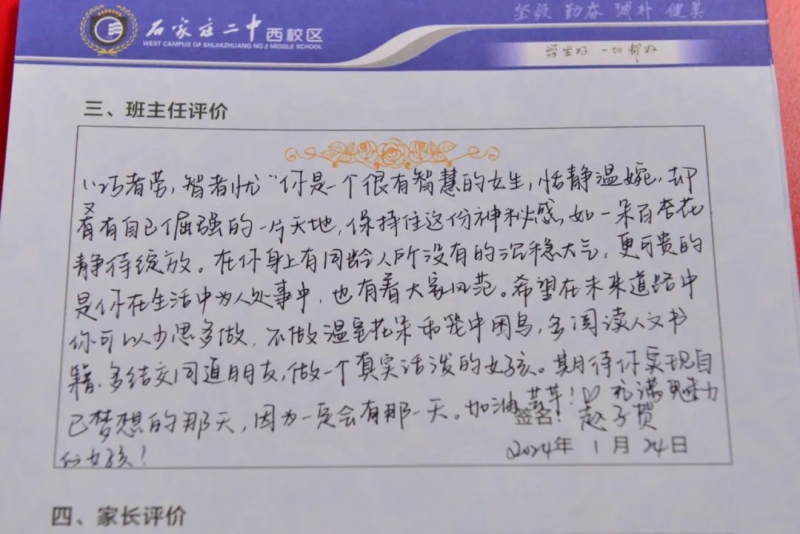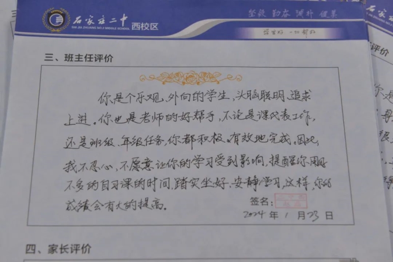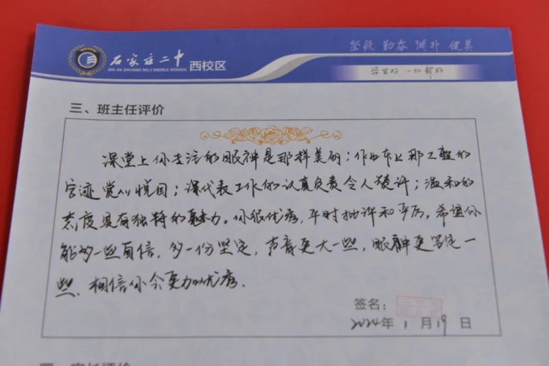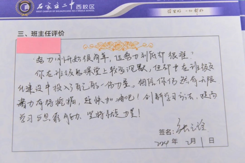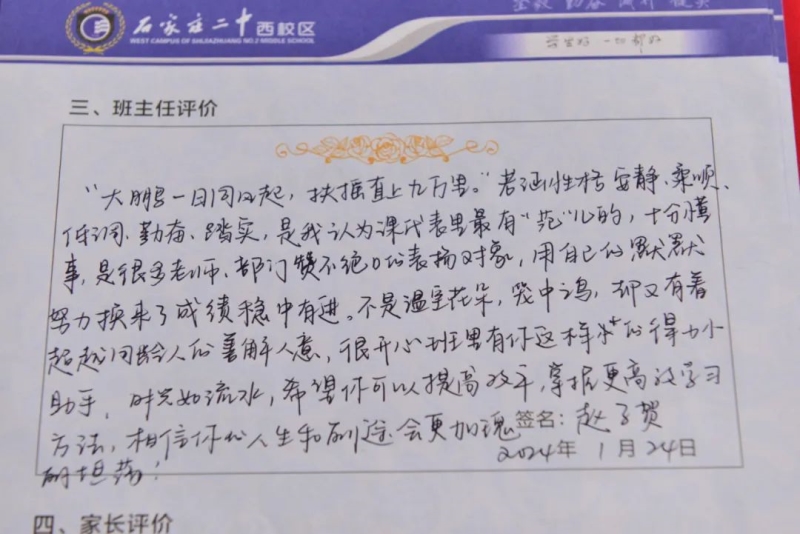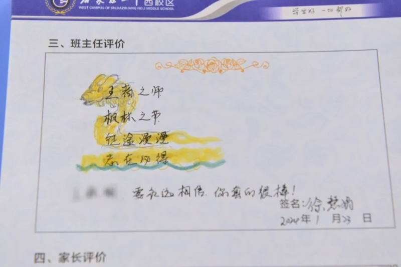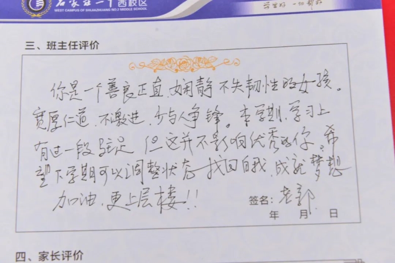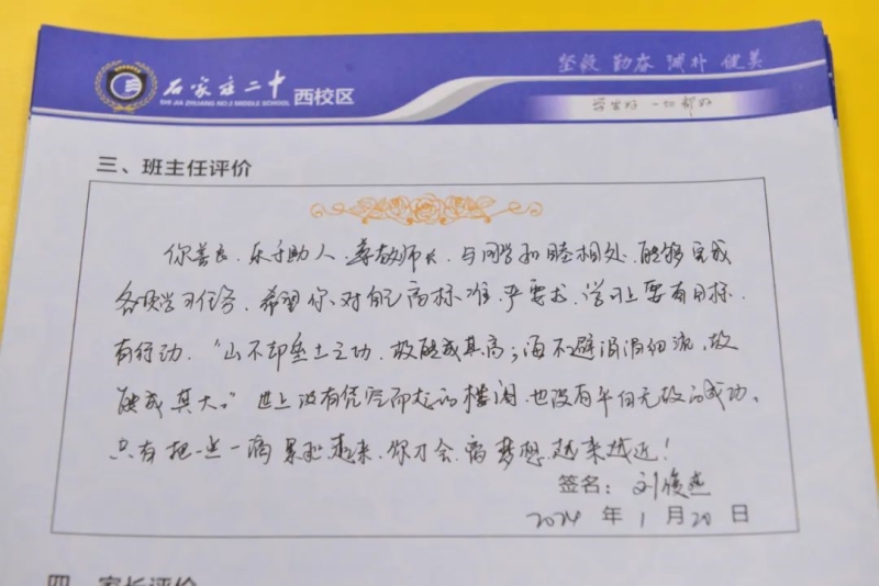 “刘家有女才貌全,妮似仙子下尘凡”、“杨柳依依醉流连,雅韵袅袅贺生天”......这些朗朗上口的诗句,是石家庄二中西校区学生收到的专属定制礼物——期末班主任评语。