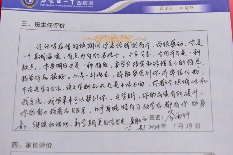 短短的评语,是老师和孩子交流的途径,是老师与家长沟通的渠道,一评一语,蕴藏着无穷的能量,蕴含着无尽的鼓励,蕴积着无限的期望。字字珠玑,句句箴言,段段入心。愿每一位二西少年都能感受到来自老师的关爱与鼓励。新的一年,踔厉奋发,笃行致远,遇见更美好的自己!